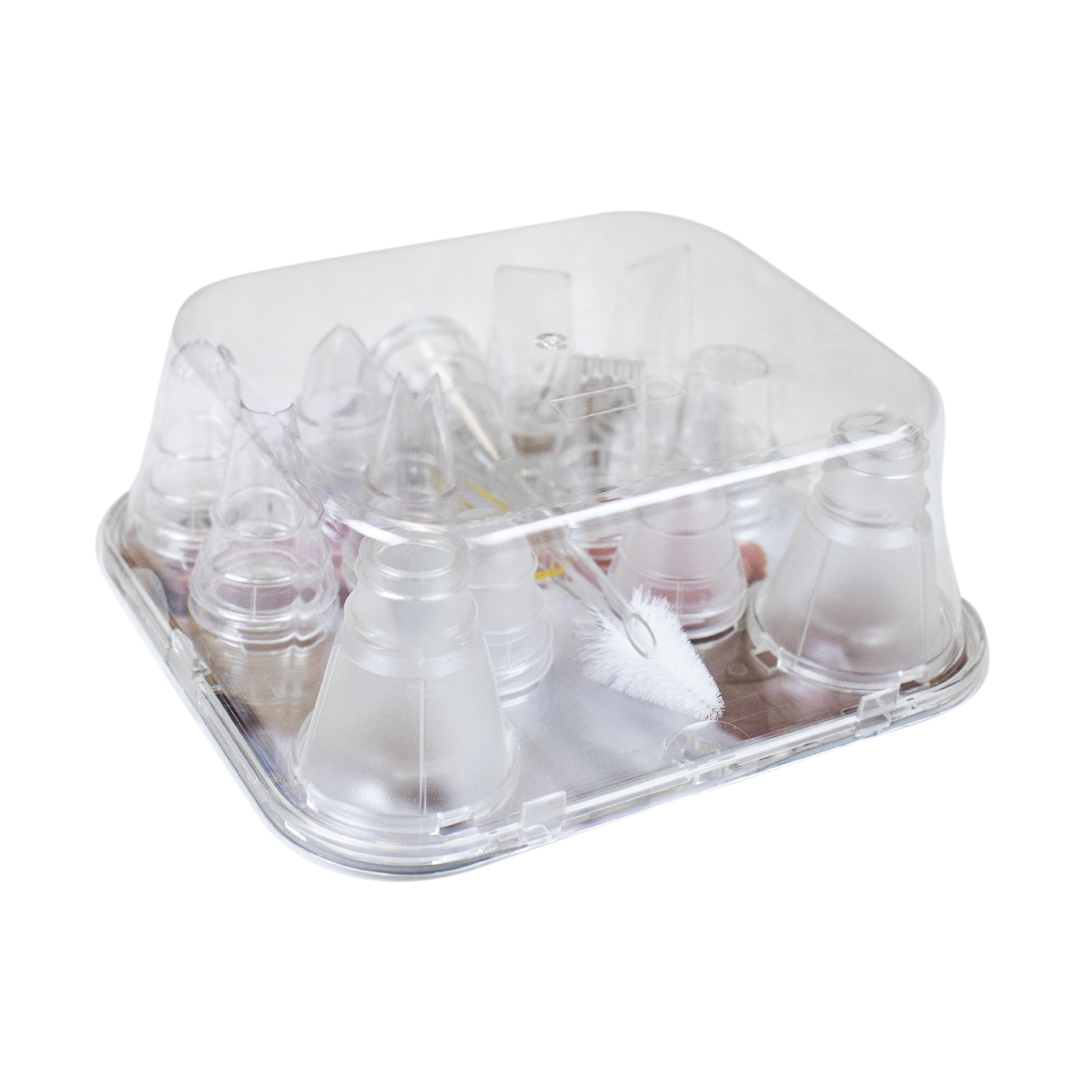 This BPA-free pack of clear, standard star plastic tips contains 8 tips, 2 couplers, 2 caps and one cleaning brush per pack.
